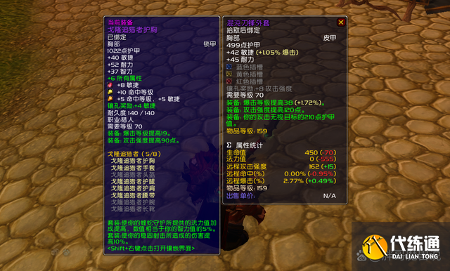 还是拿猎人的T6胸甲来对比,混沌刀锋外套在主属性方面多了2点敏捷,绿字属性方面多了19点暴击,30点攻强以及210点破甲值。