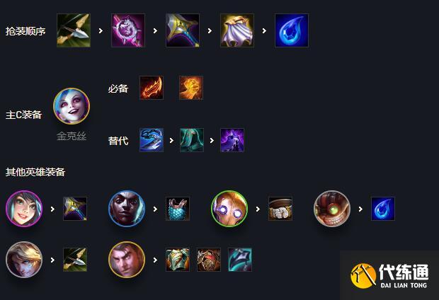 杰斯单顶,金克丝吃微光BUFF,注意防静止法衣,其他人沉底就行。