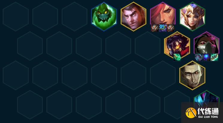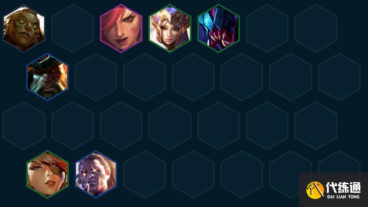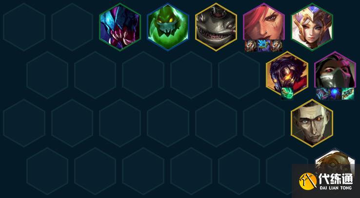 决赛圈上九,根据阵容补足希尔科、维克托和塔姆,塔姆和杰斯谁质量高上谁,站位让烈娜塔站第二排技能可以打到更多的敌方单位,希尔科站维克托和烈娜塔后面加蓝,找一个格斗单位站在底角防机器人的钩子。可以根据转职和海克斯开2黑魔、3变异(卡莎C)、6格斗(杰斯转)、3炼金(塔姆转)、3执法都可以,维克托和希尔科都二星就能轻松吃鸡!
