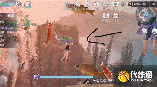 6、再回去绿藻花园传送点,往图里面右上角那个位置游,在花园中间那个大贝壳上面,游过去对话拍照。