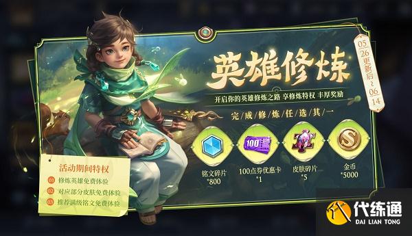 修炼过程中可获得英雄试用资格(全模式可用)、部分皮肤使用资格{直售的史诗(英雄修炼活动开启前3个月内新上架的皮肤除外)及以下等级皮肤}、满级系统铭文试用(仅修炼英雄可用);修炼达到2000能量可得英雄梦境修炼礼盒。