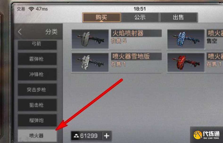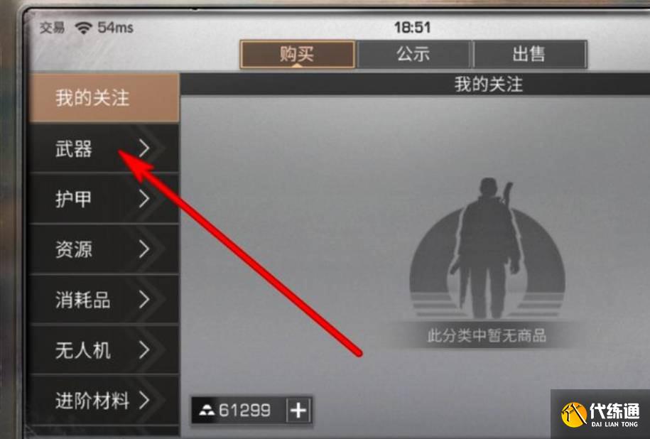 2.点击交易后,在打开的界面点击购买后再点击武器选项;