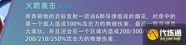 1、库奇朝他的目标发射一团由6颗导弹组成的烟花,对命中的第一个敌人造成100%攻击力的物理伤害。