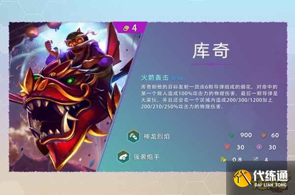 云顶之弈s7库奇技能是朝他的目标发射一团由6颗导弹组成的烟花,对命中的第一个敌人造成100%攻击力的物理伤害,最后一颗导弹是大家伙,并且还会在一个区域内造成200%攻击力的物理伤害。