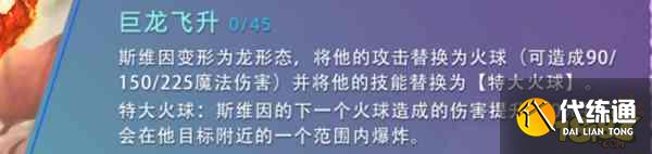 1、斯维因变形为龙形态,将他的攻击替换为火球(可造成90/150/225魔法伤害)并将他的技能替换为[特大火球]。