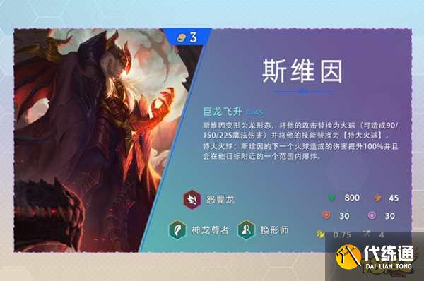 云顶之弈s7斯维因技能变形为龙形态,将他的攻击替换为火球,可造成90魔法伤害,并将他的技能替换为特大火球,特大火球是斯维因的下一个火球造成的伤害提升100%并且会在他目标附近的一个范围内爆炸。