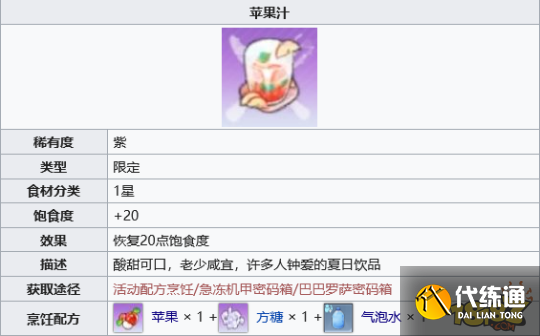 幻塔苹果汁制作攻略是效果是20饱食度,获取途径是活动配方烹饪,急冻机甲密码箱,巴巴罗萨密码箱,烹饪配方是苹果x1加方糖x1加气泡水x1,苹果活动限定食材是采集落果,方糖活动限定食材是击败艾达之子掉落,气泡水是星岛食材商人/班吉斯食材商人。