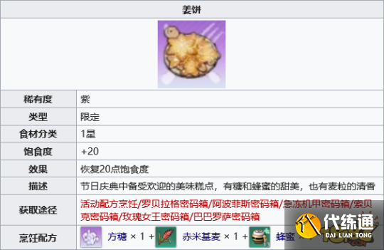 幻塔姜饼制作攻略是获得途径是活动配方烹饪,罗贝拉格密码箱,阿波菲斯密码箱,急冻机甲密码箱,索贝克密码箱等,烹饪配方是方糖x1,赤米基麦x1,蜂蜜x1,方糖活动限定食材是击败艾达之子,赤米基麦是纳维亚-草地,蜂蜜是蜜蜂掉落,采集蜂巢。