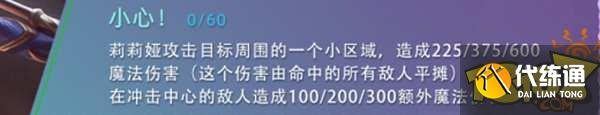 攻击目标周围的一个小区域,造成225/375/600魔法伤害 ( 这个伤害由命中的所有敌人平摊),并对处在冲击中心的敌人造成100/200/300额外魔法伤害。