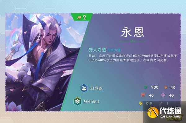 云顶之弈s7永恩技能狩人之道被动是永恩的普通攻击将造成30或60或90额外魔法伤害或基于30或35或40%攻击力的额外物理伤害,在两者之间交替,永恩生命值是900,攻击力是40,护甲是40,魔抗是40,射程是1。