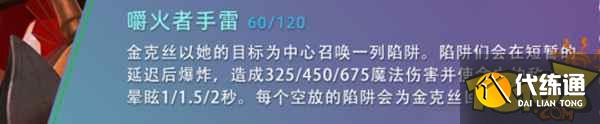 金克丝以她的目标为中心召唤一列陷阱。 陷阱们会在短暂的延迟后爆炸,造成325/450/675魔法伤害并使命中的敌人们晕眩1/1.5/2秒。每个空放的陷阱会为[金克丝]回10法力。