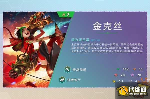云顶之弈s7金克丝技能嚼火者手雷是金克丝以她的目标为中心召唤一列陷阱,陷阱们会在短暂的延迟后爆炸,造成325或450或675魔法伤害并使命中的敌人们晕眩1或1点5或2秒,每个空放的陷阱会为金克丝回10法力。