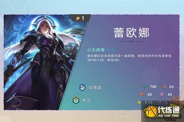 云顶之弈s7蕾欧娜技能日炎屏障是蕾欧娜在自身周围创造一道屏障,使受到的所有伤害降低30或40或120持续4秒,蕾欧娜的生命值是700,攻击力是65,护甲是45,魔抗是45,射程是1,费用是1费,羁绊是幻境龙、护卫。