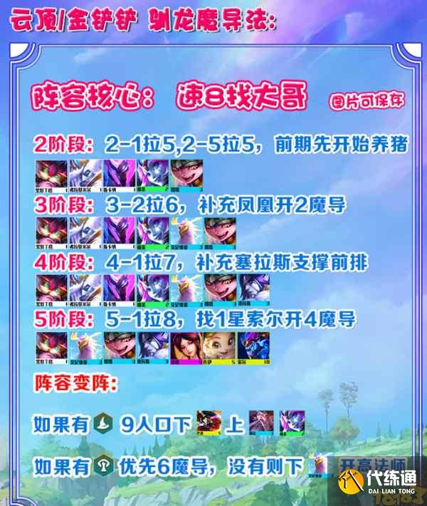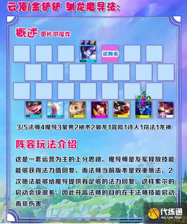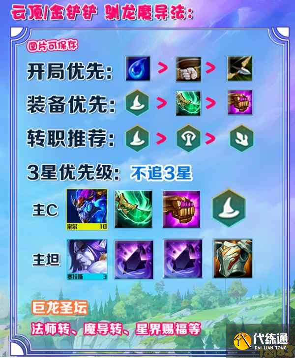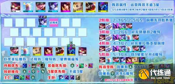 阵容前期以围绕着驯龙+法师为主的运营过渡,建议开局能拿到铲子做出法师转就无脑玩,驯龙来得越早后期的坦度则越高,即使来得迟也没关系,法师和魔导师都需要这两个英雄。