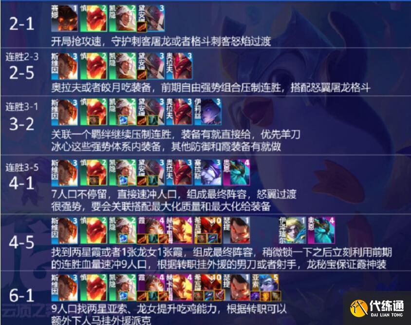 2-1上4人口,2-5上5人口前期压制连胜(5人口的时候羁绊就可以成型,2格斗2屠龙2狂刃2刺客加上3怒翼),