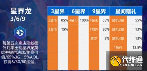 每第五次商店刷新额外几率出现星界龙英雄并提供法球/更高价值/65%3G,5%AOL,获得5/30/60法强。