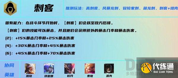 羁绊效果:固有能力,在战斗开始的时候,刺客们会跳跃到地方的后排,刺客们的技能可以进行暴击,并且他们会获得额外的暴击几率和暴击伤害。