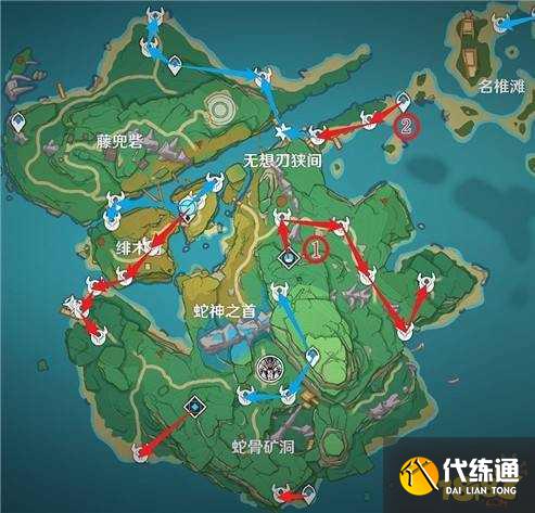 2、无想刃狭间:红色线路为高效线路,适合日常刷取。蓝色线路适合急需补充,其中1号线路第三点位、二号线路第二点位均需走到对应位置触发。