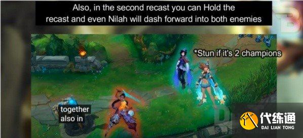 第二种是Nilah将捆绑的目标往一个方向扔,如果撞到敌方单位会造成减速效果,如果撞到敌方英雄会造成眩晕,同时Nilah自己朝这个方向突进一段距离。这不就是带位移的烈娜塔Q技能?
