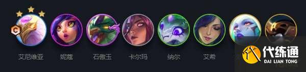 阵容成员:艾尼维亚、妮蔻、石傲玉、卡尔玛、纳尔、艾希、索卡拉、巴德,主C是艾尼维亚。