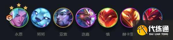 阵容成员:永恩、布隆、锤石、宝石、蕾欧娜、亚索、迭嘉,主C是永恩。