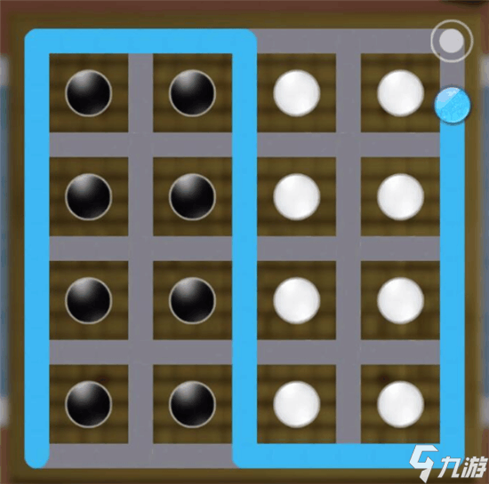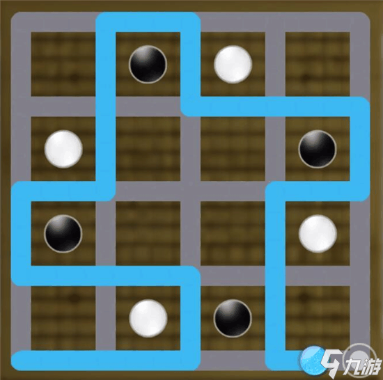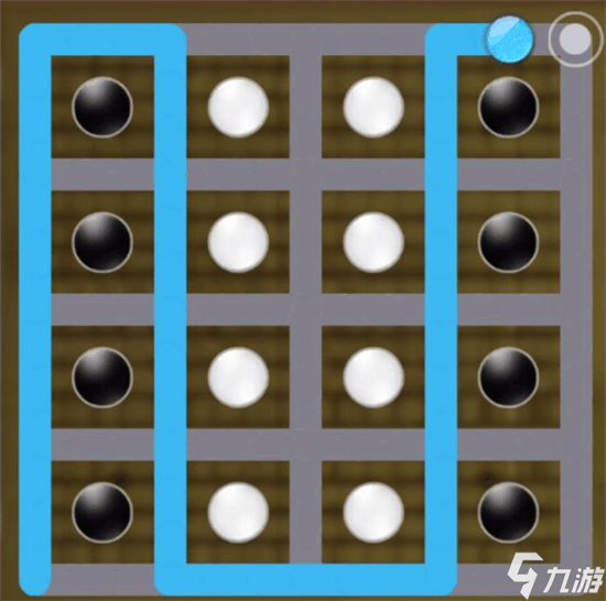 这个棋局的解法有三个,前两个棋局的解法比较简单,玩家都能解开,第三个棋局比较复杂,玩家较难解开。第一个棋局通过画曲线的方式,将左右两侧的黑白棋子从中间转折之后,完美分隔开来。第二个棋局稍微复杂,玩家通过第一列与第三列处的转折,将黑白棋子完美间隔开。第三个棋局思路清晰之后,棋子分隔也比较简单。玩家从左下角开始通过黑白棋子的接替转折,将黑色棋子框在中间位置,让白色棋子处于外围。