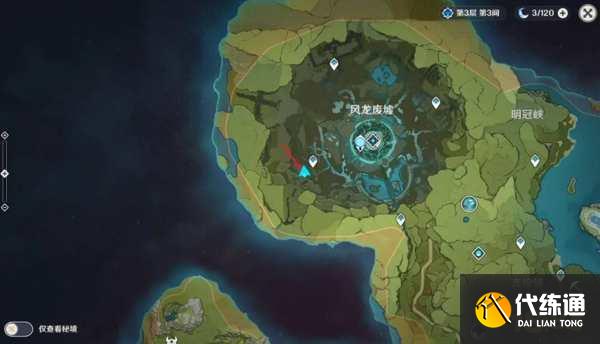 1、传送到风龙废墟最左边的传送锚点,接着走到下图红箭头所示的位置;