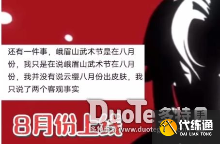 峨眉武术节在8月9日开幕,最晚会在这个时候上线,在之前的王者零距离问答中,关于国风英雄及皮肤中也提到了云缨,所以这款皮肤一定会出