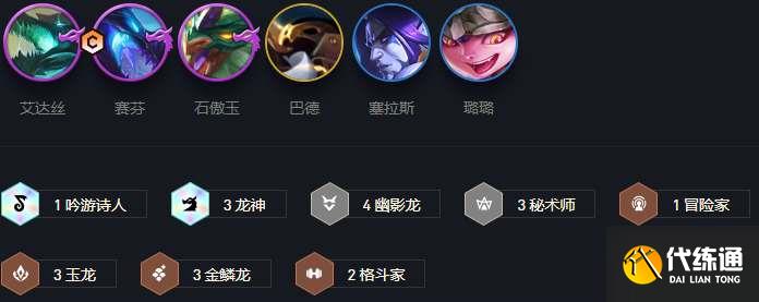 4阶段划水两波,4-3大选后升八开D质量,D出艾达丝,赛芬,石傲玉这三张龙神,搭配上塞拉斯组成两格斗四幽影或搭配锤石组成两护卫四幽影,搭配璐璐组成两秘术,5-1再次大D将龙神全部补到二星,后面攒钱上九后可将幽影换成派克,秘术再带上巴德凑出三秘术。