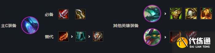 主C赛芬的饮血和无尽是必备的装备,因为饮血可以提供持续作战能力和一个保命护盾不会被输出激活后就直接秒掉,而无尽则是配合赛芬技能一头撞到后排后,保证能秒掉撞到的后面棋子(如果直接撞到主C秒到则可直接团战致胜)。第三件优先羊刀,羊刀慢慢叠加攻速后加上幽影攻击力加持,打到后面可以收割战场,没有的情况下水银提供一个免控,或者泰坦提供更高的坦度和爆发也是不错的选择。不过在现在秘宝龙的宝藏下可以刷新装备,还是基本能凑出住C的三个神装的。