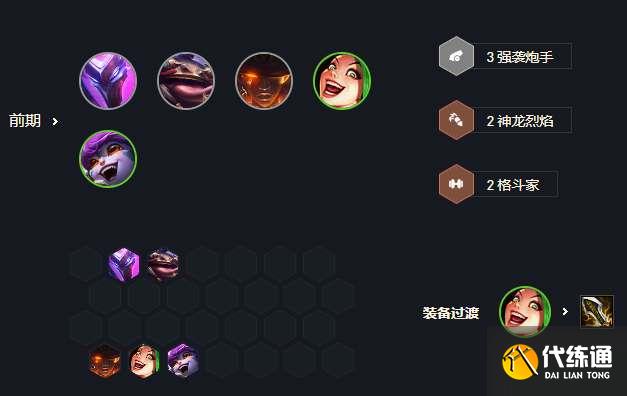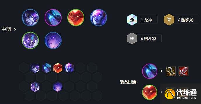 3-1刷海克斯的阶段如果能直接出龙神联盟/部落,则可以获得一张八费龙神,3-2直接拉六口上出龙神保证连胜。在3-1没有刷出龙神联盟/部落的情况下,3-2正常升六开出四格斗两炮手,此时连胜或者连败斗可以,不用D牌。过渡到4-1海克斯如果刷出龙神联盟/部落,则直接四斗带龙神准备上八。如果4-1海克斯仍然未出龙神联盟/部落,则选择直接转型到幽影格斗赛芬或者玉龙秘术九五这两套阵容上来。
