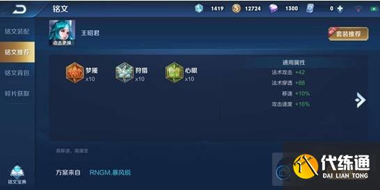 2.铭文搭配:10梦魇 10狩猎 10心眼。梦魇提供法强和法穿,增强王昭君伤害能力,狩猎提供的攻速帮助王昭君更好地打出平A被动,提高手感,由于王昭君本身是没有位移的,狩猎提供的移速提高王昭君机动性,心眼提供的攻速和法穿同理。