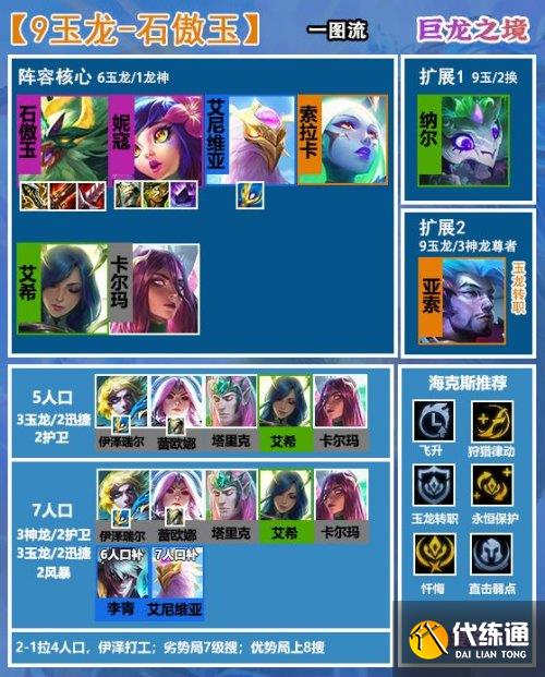 阵容扩展:“纳尔”可替换成有【玉龙转职】的“亚索”,组【3神龙尊者】