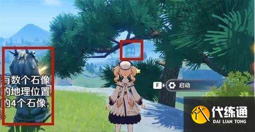 3、第三个机关在正对着湖中树的那个石像,玩家可以站到石像的前面,看到对面有湖中树就可以了;