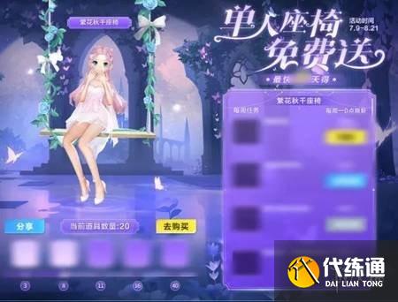 7月9日-8月21日,完成每周任务积累进度,达到40点进度即可获得繁花秋千座椅~也可使用点券/钻石购买进度,最快10天得~