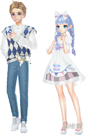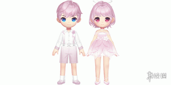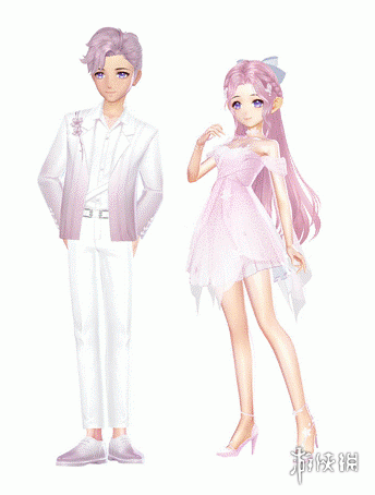男装衣服与鞋子上晕染出的粉白色映衬的神色温柔而体贴,女装粉色裙子配以晕染效果的白色柔纱,温婉中透露着可爱。