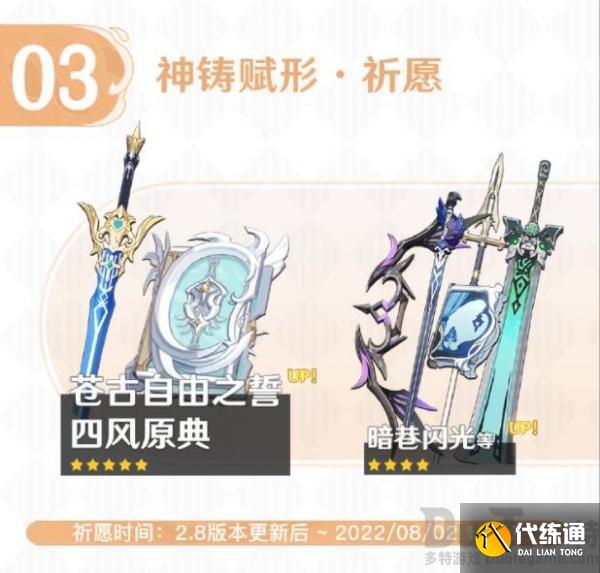 活动期间,可使用「神铸定轨」对本期五星UP武器「单手剑·苍古自由之誓」或「法器,四风原典」进行定轨,更多