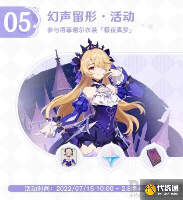 活动期间,收集指定数量的「幻境海螺」,即可获得菲谢尔衣装「极夜真梦」、原石等奖励。