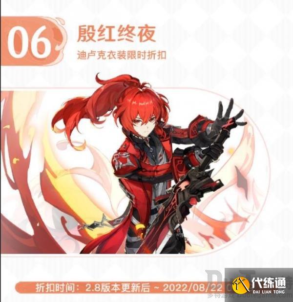 2.8版本更新后,迪卢克衣装「殷红终夜」永久上架商城。迪卢克衣装「殷红终夜」将增加闲置动作表现、战斗特效、战斗语音及闲聊语音。
