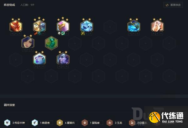 这是上九后的超大成阵容图,不过正常情况下都是上不了九的,八人口找到三星艾尼维亚和三星沃利贝尔即可大成。现在先对阵容进行一下分析:阵容以3传奇半神为主,4重骑兵为辅。这套阵容至少需要一个重骑转给艾尼维亚,让艾尼维亚从一个后排输出位变成一个又坦又输出的前排位,通过承伤回蓝高频释放技能;第二件科技枪必备,第三件装备反甲板甲优先。可能会有人担心艾尼维亚扛不住,那是不可能的。因为重骑兵开局可以获得高额双抗,同时艾尼维亚还可以吞噬一个带肉装的重骑兵,获得了那个重骑兵40%的双抗和100%的生命值,即使是幽影龙赛芬的技能也能抗住。当然了,艾尼维亚主要还是担任坦位,主C还得是沃利贝尔来,沃利贝尔必备羊刀水银;但因为艾尼维亚带了科技枪的缘故,其技能不仅可以给队友回血,还可以破对面双抗,所以沃利贝尔可以不给饮血,甚至不给第三件装备;我们转而去给被艾尼维亚吞噬的那个重骑兵做一套肉装性价比更高。