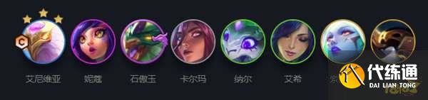 阵容成员:艾尼维亚、妮蔻、石傲玉、卡尔玛、纳尔、艾希、索卡拉、巴德,主C是艾尼维亚。