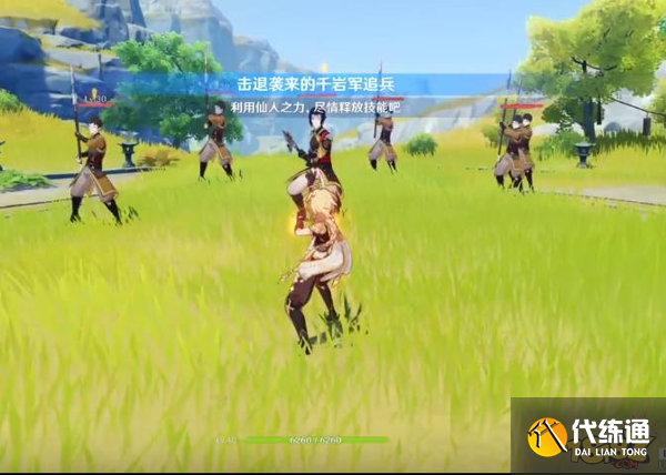 3、对话结束后,会出现千岩军来抓捕你,这时削月筑阳真君会给你一个释放q技能不掉能量的buff(但还是有冷却),让你更快的打败千岩军,在你打败所有的千岩军后,会再次进入到剧情中,与削月筑阳真君开始对话。