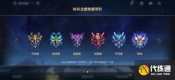 3.峡谷之巅分为6个专属等阶:开拓者,挑战者,超越者,征服者,不灭者,传说。除传说段位为单独等阶,峡谷之巅积分无上限之外。其他段位都分四个子等级,提升200分晋级一个等级,每提升800分晋升一个等阶。