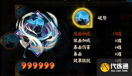 2、破势:因为在战斗技能上,般若先封印对方,然后可以利用破势增加伤害来修正对方的HP,方便随后的茨木等主力输出进行收割。。您可以使用 6 个爆发,或 2 个暴击套 + 4 个爆发套。因为般若三火技能的伤害有限,第四位选择攻击加成,第六位选择暴击,第二位选择速度。