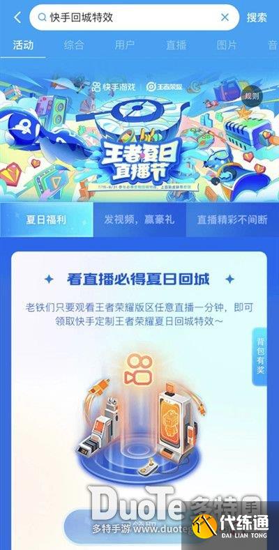 上快手,搜索【快手回城特效】,找到王者夏日直播节活动,直接进入活动页,观看王者专区直播一分钟必得快手定制回城特效,限时领取至8月31日,永久免费使用。更有荣耀积分、皮肤碎片、貂蝉-仲夏夜之梦、公孙离-无限星赏官等永久皮肤,限时邀请快手新用户免费获得。