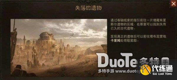 1、冒险者达到55级,地狱模式下抵达夏斯尔沙海后开启失落的遗物事件