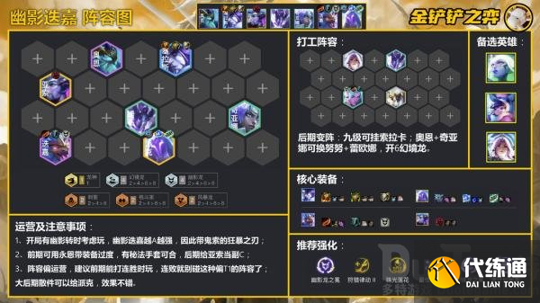 金铲铲之战当前赛季中幽影迭嘉这个阵容比较强,可能有很多玩家还不知道怎么玩,那么下面小编就给大家带来金铲铲之战幽影迭嘉阵容攻略。
