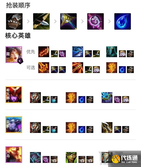 主C霞巨人捕手和鬼索的狂暴之刃必备,巨人捕手保证霞的伤害即使面对坦度极高的前排都不为惧,同时还可以配合技能倒钩轻松处理后排;其次鬼索的狂暴之刃增加霞的攻击速度,让霞的羽毛以及伤害更高更多,第三件套可以选择续航输出类的装备,比如:正义之手,水银,锐利之刃