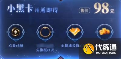 3、小黑卡售价98元一张,购买后可获得100峡谷宝典经验值。