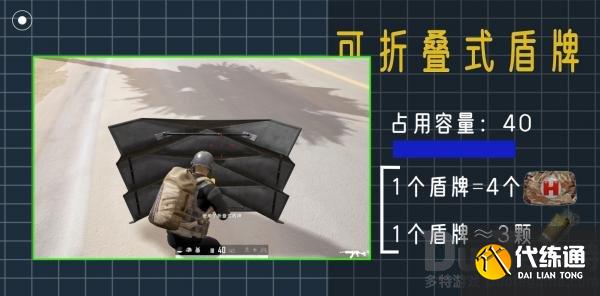 可折叠式盾牌的占用容量为40,这意味着它不占用主武器栏,可以单独放在背包中。也就是说,1个盾牌占用量等于4个大包的占用量。或者约等于3颗烟雾的占用量